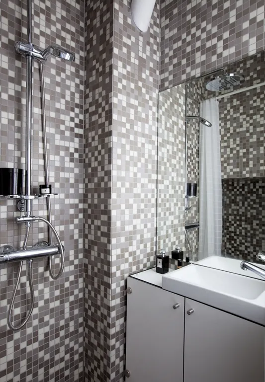 卫生间使用马赛克墙砖打造独特的视觉效果,因卫浴空间实在太小,设计则选择清淡的三配色,从视觉上避免卫浴间过于拥挤,沉静平和。
