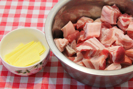 2、五花洗净切成2厘米左右的方块,姜切片;