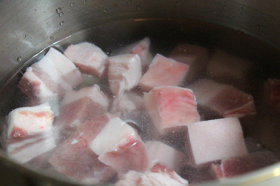 3、锅中加入适量的清水,冷水下锅,倒入五花肉、适量的料酒,大火煮开后、撇去浮沫,捞出备用;