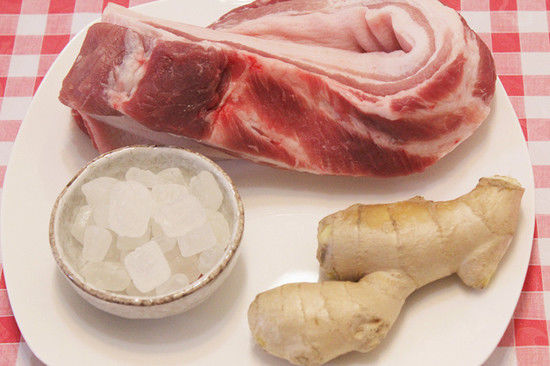 1、准备食材。五花肉一块、姜一块、冰糖一小碗;