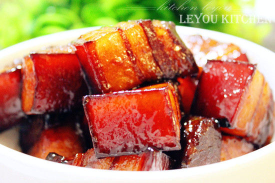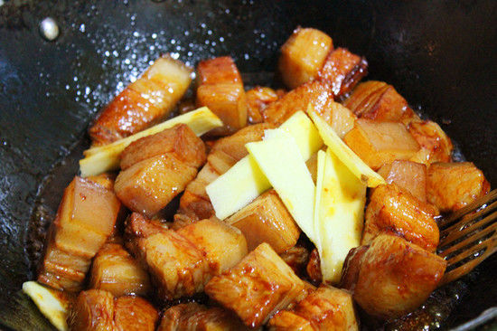 6、将五花肉倒入锅内,转中火,快速翻炒,让每块五花肉都裹上糖色;