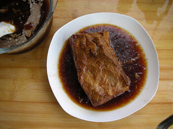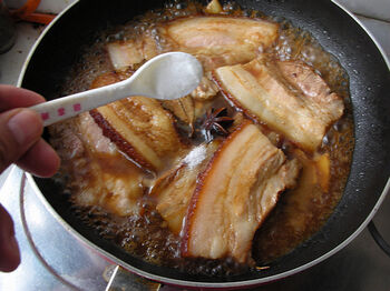 2、捞出煮好的五花肉,趁热抹上老抽上色,腌渍1小时。讲究点的可以抹上一些蜂蜜。