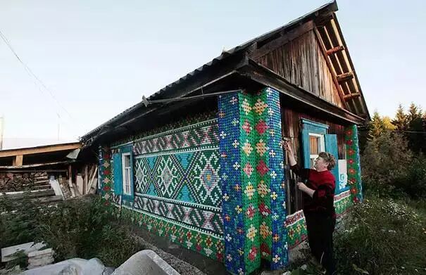 这是一位退休老人用30,000个塑料瓶盖装饰了自己的房子——多彩的图案和纹样让乡村的小屋成为当地小有名气的地标建筑。