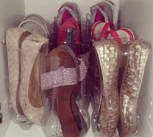 女生平底鞋、凉鞋啥的,配好对塞到半截瓶子里。防止变形又好找。我就这么没想到呢,这样子再也不用被老妈说, 整个鞋柜都是我的鞋子了。