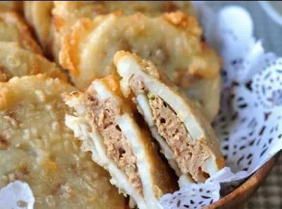 2. 一个藕片填馅,另一个藕片对压,使馅子能填充到藕片的窟窿里,可以更好的固定两片藕。