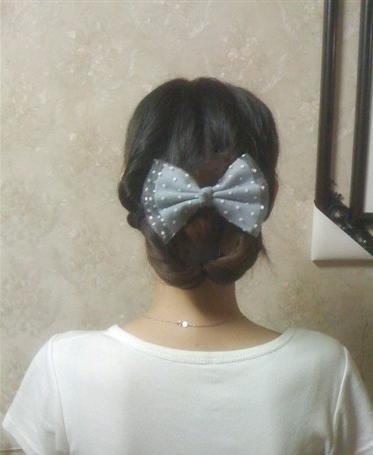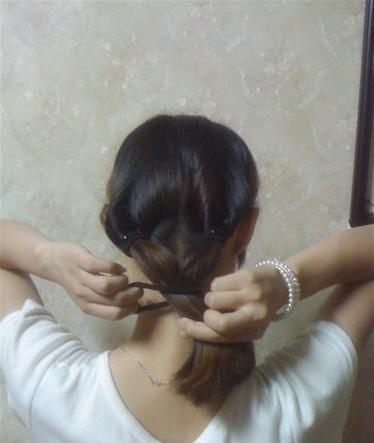 那整个发尾部分用皮筋固定好,如图所示,然后把头发向两侧拉成一个花苞形,用卡子固定好就完成了,很简单实用的一款。