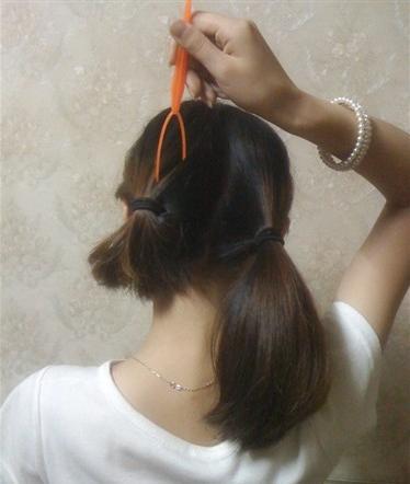 高高梳起一个马尾,用穿法针从马尾中间穿过去。马尾穿过工具的圈圈,抓住盘发针用力往下拉整个辫子翻起来。