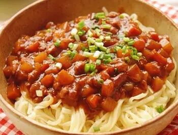 原料:面条、胡萝卜、土豆、里脊肉、甜面酱、海鲜酱、香茹酱