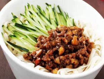 原料:猪肉馅150克、香菇200克、面条(生)300克、花生100克、啤酒1听、黄瓜1根、油、黄酱150克