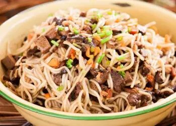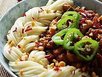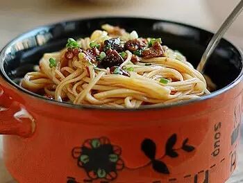 原料:面条(生)150克、盐1/2茶匙、酱油1/2汤匙、生抽1汤匙、米醋1/4汤匙、细香葱5根、葱油2汤匙、牛肉酱1汤匙、白糖1茶匙