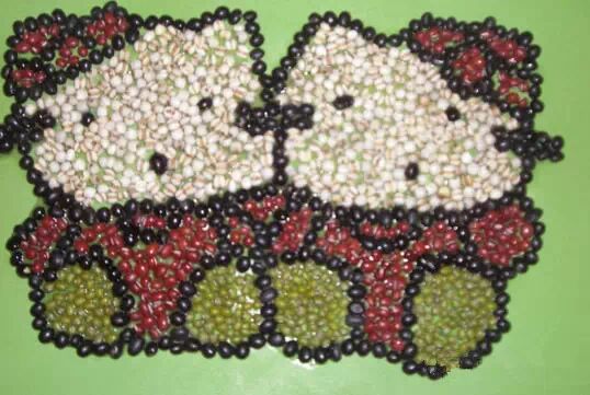 腿部用绿豆装饰,脸部用以仁装饰,一幅完整的KIT猫豆子画就完成了。
