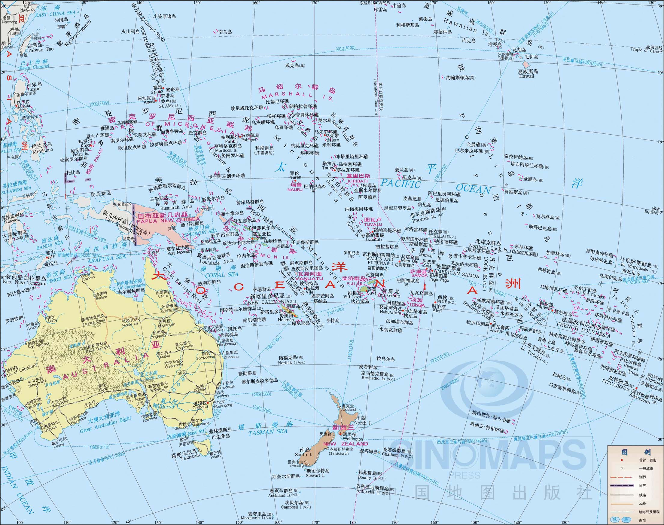 澳大利亚、新西兰、巴布亚新几内亚、所罗门群岛、瓦努阿图、密克罗尼西亚、马绍尔群岛、帕劳、