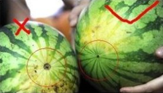 1、西瓜底部的圈圈,越小越好,相反的,底部圈圈越大,皮越厚,越难吃。