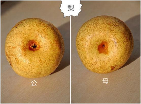 买梨时看梨的底部,母梨是有着圆圆的光滑的深窝窝,公梨的尾部是像朵花似的