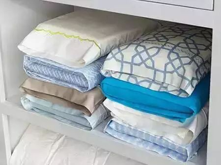 4床单、被套、枕头套都乱乱的不好收拾,把同组的叠好塞进枕头套里就行啦!