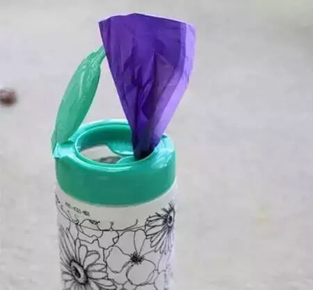 7一大堆塑胶袋不好放?用湿纸巾罐装起来,用的时候抽一个就可以了,还节省空间呢。