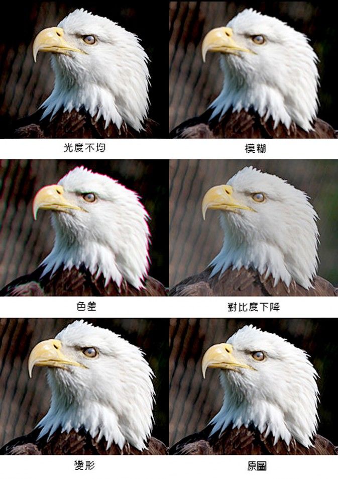 我们说一支镜头的质素高,通常是指其像差(Optical aberration)不明显。所谓像差,即影象在经过镜头后,所出现失真状况。下面是各种失真状况所发生时最极端例子(原图在右下以作比较):