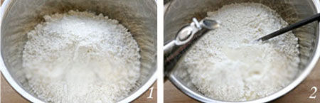 1、面粉置于一大盆中;一边缓缓倒入开水,一边用一根筷子快速搅拌;