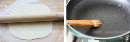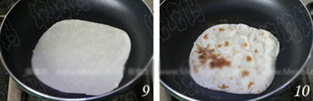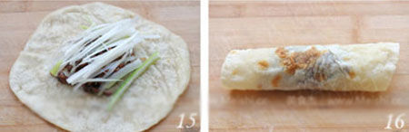 9、正宗传统的春饼,是要把两到十个饼坯中间刷油后合起来擀成面皮,然后再加下锅烙或者蒸,等吃的时候再一层层揭开的,但我这人吧怪异,我喜欢吃那烙饼表面上烙焦了的那黑点,而且喜欢焦的地方多一点,所以我家的春饼,是两面都烙了的,不喜欢我这种做法的朋友,可以不象我这样做,重叠擀皮后再揭开的饼皮更薄一些,这个就随各人喜好了!这道主食小孩子一般也很喜欢,不喜欢大葱的生辣味儿的,可以换成黄瓜丝或者胡萝卜丝,这样孩子们可能更喜欢吃一些!