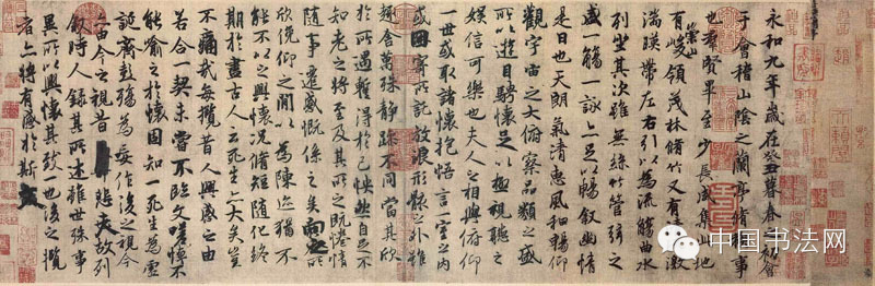 章法的行气贯通,就是分布“累成行,缀成篇”,以行间的气脉贯穿通畅,表现出篇幅的气韵生动,浑然天成。书幅行气的气,就是王羲之所说“若书之气,必达乎道”的气。这种气,是书法的气脉,蕴含于书幅的各方面,而蕴寓在行列中间的气,称为行气。蒋和在《书法正宗》中说:“一字八面灵通为内气,一篇章法照应为外气……外气言一篇有虚实、疏密、管束,接上递下,错综映带。”蒋骥在《续书法论》中说:“篇幅以章法为先,运实为虚,实处俱灵;以虚为实,断处仍续。”这表明书法的气,虽然是看不见的,但是经过书法家有法有化的书写,就能使之显现出来。也就是把字与字、行与行之间的疏密、连断、向背、虚实等关系,进行“违而不犯,和而不同”的辩证安排,实施“穷变态于毫端,合情调于纸上”的巧妙书写,从而创作出形神兼备的书法艺术精品,其行气也就显然可见了。例如,我们看到的《兰亭序》,虽然是唐人临慕的,但是行气还是隐约可见的;而怀仁的《集王圣教序》,同样是王羲之的字,显然缺少行气。