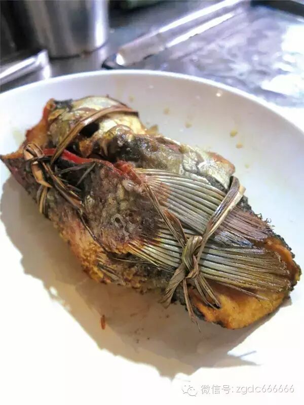 取一条烤好的鲫鱼,表面刷匀自制辣酱20克,放入刷有香料油的烤盘摆进烤箱,上下火200℃烤3分钟,垫着粽叶摆入托盘,撒蒜末8克、大叶香菜碎、香葱碎各5克、香茅草碎3克,周围摆苦菊、水萝卜片、香瓜段点缀,上桌后由服务员剪断香茅,用刀叉将鱼肉分块后再端给客人食用。