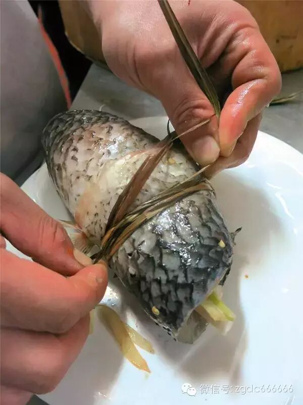 2、将腌好的鲫鱼鱼皮朝下放入盘中,分别放入腌制所用的料头20克、海鲜菇10克(提前加花椒盐水泡20分钟入味),将鱼身卷起,捆上提前泡软的干香茅草固定,下入七成热油炸1分钟至定型,捞出沥油,摆进托盘,入上下火200℃的烤箱烤10分钟,取出备用。