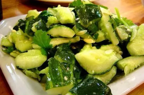 材料:黄瓜 1根、蒜 2瓣、食盐 1/3茶匙、白糖 1/2茶匙、米醋 1茶匙、芝麻油 少许