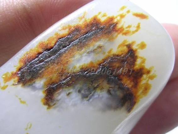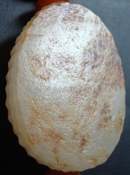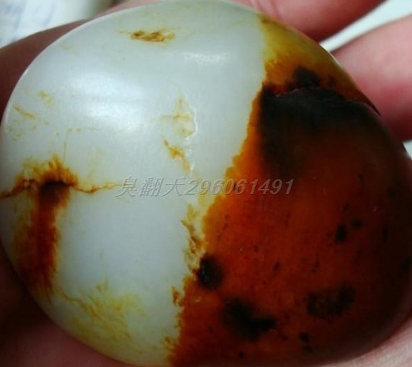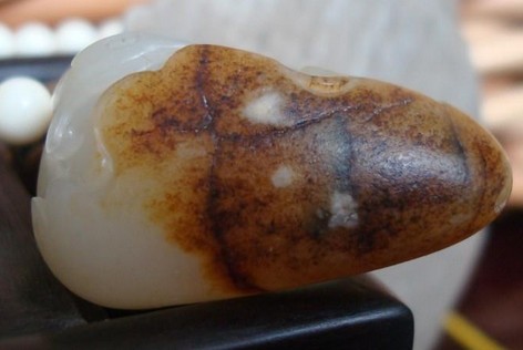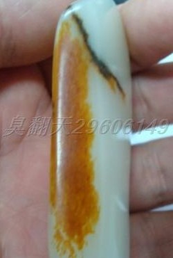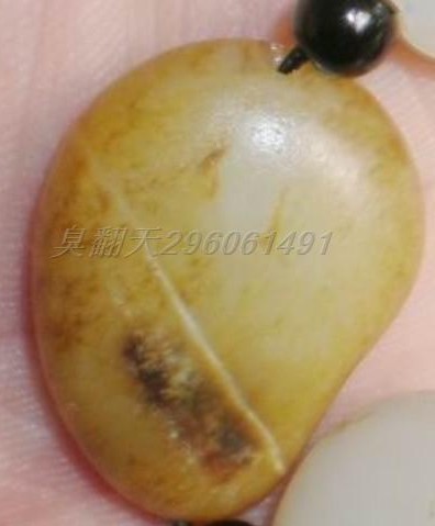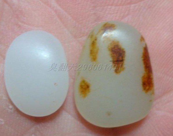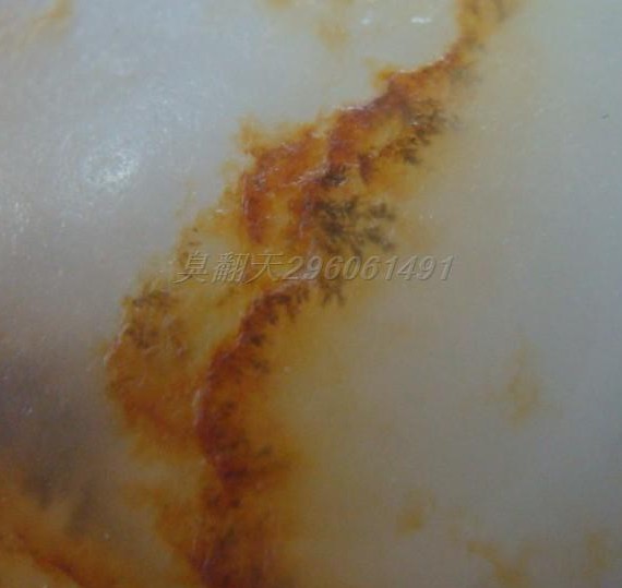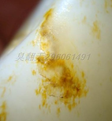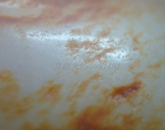 很多籽料表面上有僵斑的存在,不管软僵,硬僵、石性、玉性、石灰化……,但如果一块籽料人工染色,碰到僵斑,僵斑上肯定有色。但是要小心先染色后烧僵的现象,这样僵斑是无色的。