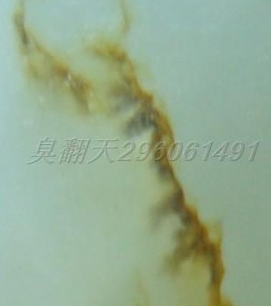 只要染过色的玉,在裂隙处总有处理不干净的颜色残留,并且只在裂隙表面,很难渗入裂隙根部。即使有,裂隙外的颜色也是裂隙内多少倍的对比度。