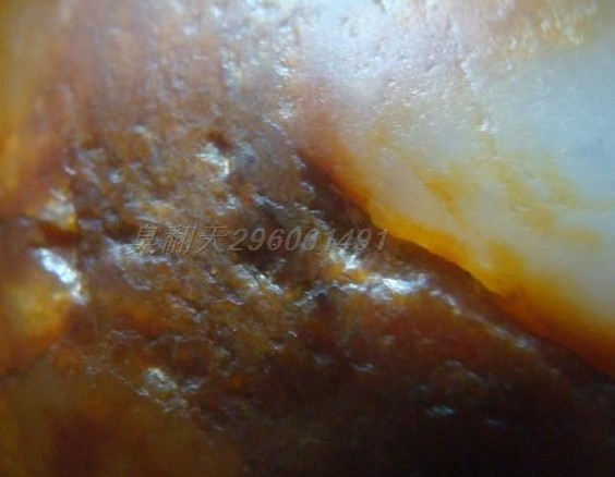 那么很简单,同样一个表面,越粗糙的地方越容易附着颜色。毛孔坑底的附着性肯定比坑上面的强得多。也就是说,天然颜色会跟着毛孔的分布不断变化,远看皮色会有浓淡的过渡,这个过渡跟玉的结构大小会有疏密的变化。并且这个颜色近看的时候,是跟着毛孔的形状而紧密结合的。也就是说,毛孔怎么走,颜色的边界始终跟着毛孔的边界同步延伸。毛孔怎么不规则,颜色也怎么不规则。