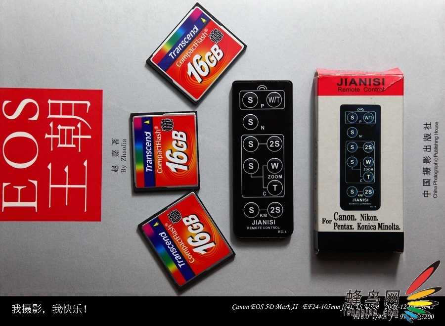 当5D2的主要功能研究透了之后,我突然想起以前曾经给尼康D40和D40x配过一个小遥控板,并从柜子里将其找了出来,因为我记得当时我在北京马莲道买这个东西的时候(好像是60元),店家说是万能的。这是一个三无产品,包装上仅仅写着Made in China,此外一个中文字也没有。里面也是一样,有一个全英文说明书,好在俺是英文翻译,没有语言障碍。我仔细看了看,英文质量还真不错,水平很高,但里面并没有提到佳能的5D,倒是罗列了一大堆小DC的型号,以及佳能的350D、400D和尼康的D50、D70和D80等。