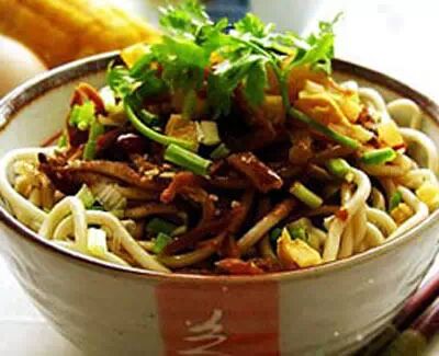 10、将调好的芝麻酱、花生碎榨菜千张丝辣椒油倒在面条上,撒上盐、少许味精醋,再撒上香葱末香菜末拌匀即可