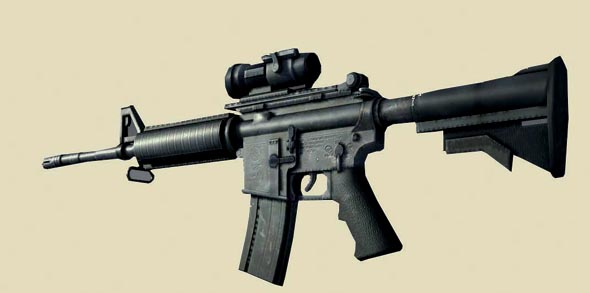 特点:M4A1卡宾枪(M4A1 carbine) 是其中一种M4卡宾枪的衍生型,主要特点是体积轻巧,它取消原有握把,改成可自由附加其它装置的M1913战术滑轨,加装了内红点瞄准镜和战术强光手电筒,提升了夜战能力和命中率。它发射5.56毫米枪弹,由于能全自动射击,火力强大,在近距离短兵相接中极具威力。被用作特别作战用途,亦是现在最常见的版本。现时主要装备美军各常规部队及特种部队,包括三角洲特种部队、美国海军海豹部队、美国陆军游骑兵及美国海军陆战队。由于M4A1射程远杀伤力大而结构又比较紧凑,也受到其他作战部队及非一线作战人员的钟爱。