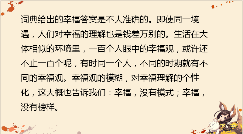 老散仙 说:词典给出的幸福答案是不大准确的。即使同一境遇,人们对幸福的理解也是钱差万别的。生活在大体相似的环境里,一百个人眼中的幸福观,或许还不止一百个呢,有时同一个人,不同的时期就有不同的幸福观。幸福观的模糊,对幸福理解的个性化,这大概也告诉我们:幸福,没有模式;幸福,没有榜样。