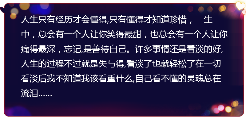 这个一无所知的世界,只有走下去,才有惊喜。别指望所有的人都能懂你,痛过,才知道如何保护自己;哭过,才知道心痛是什么感觉;傻过,才知道适时的坚持与放弃;爱过,才知道自己其实很脆弱。其实,生活并不需要这么些无谓的执着,没有什么就真的不能割舍。