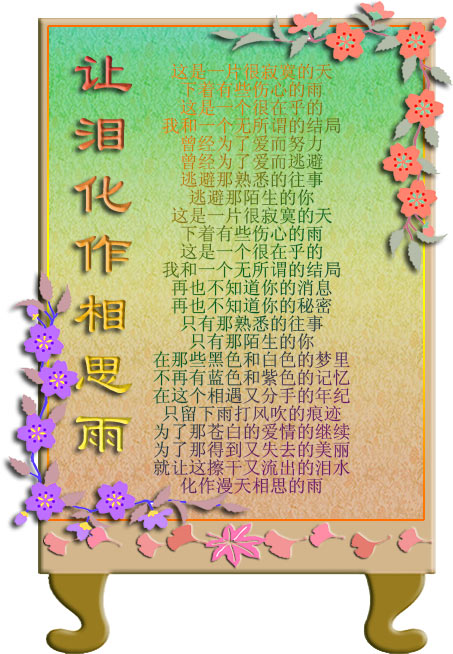梦 [ft=#99ff66,5,楷体_gb2312][B]梦:总不够漫长,可是我们需要梦想.情:总让人受伤,可是我们念念不忘.雨:下得再漂亮,但我还是喜欢阳光.你:离得再遥远,但我从未将你遗忘.[/B][/ft]