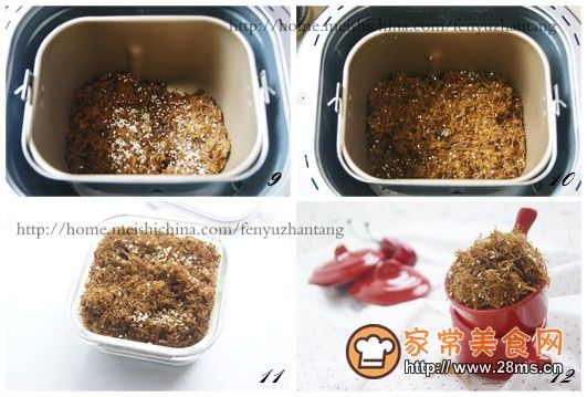 4、面包机火力不同,时间根据自己的机器斟酌,工作到肉松干燥酥松,上色和干湿度满意即可提前出炉,我用了1个果酱程序加30分钟。