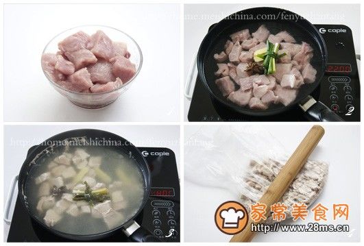 材料:猪后腿肉500克、葱1根、姜2片、八角1粒