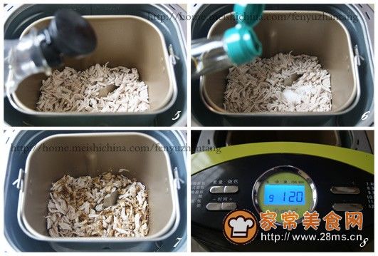 5、将丝放入面包机内(如果有筋膜这个时候可以用手撕开),倒入2汤匙玉米油,再放入盐和白糖。