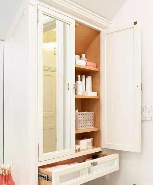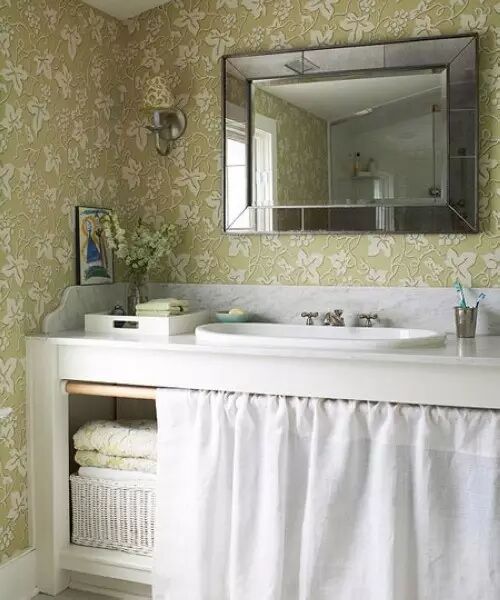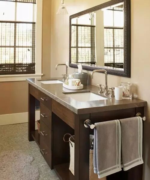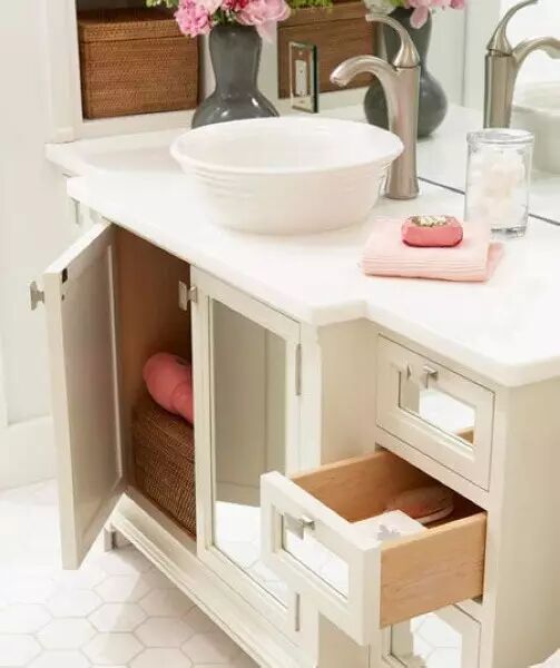 利用台盆下面的空间做收纳,可以将洗漱台做成一个开放式的抽屉,收纳毛巾、浴巾、洗漱用品和护肤品,拥有良好的透气性的同时,还可以成为一个展示空间。