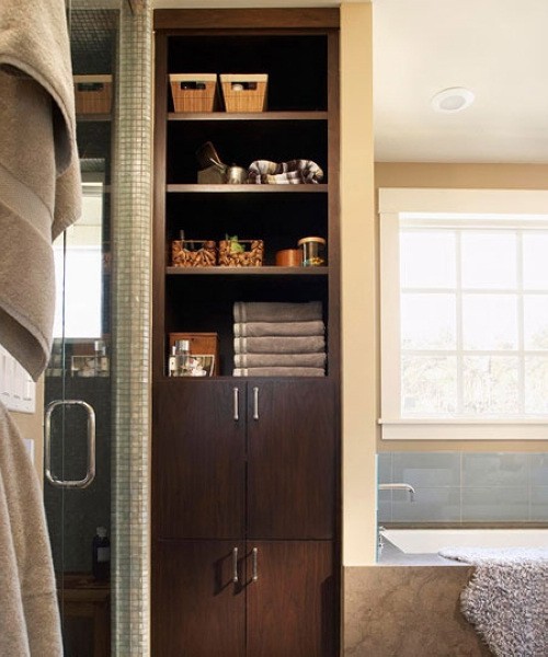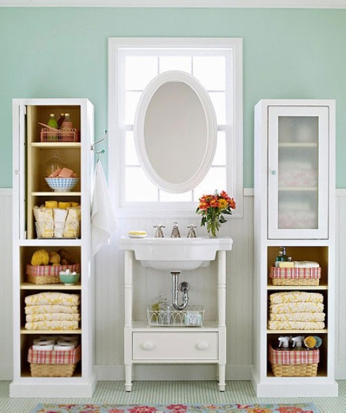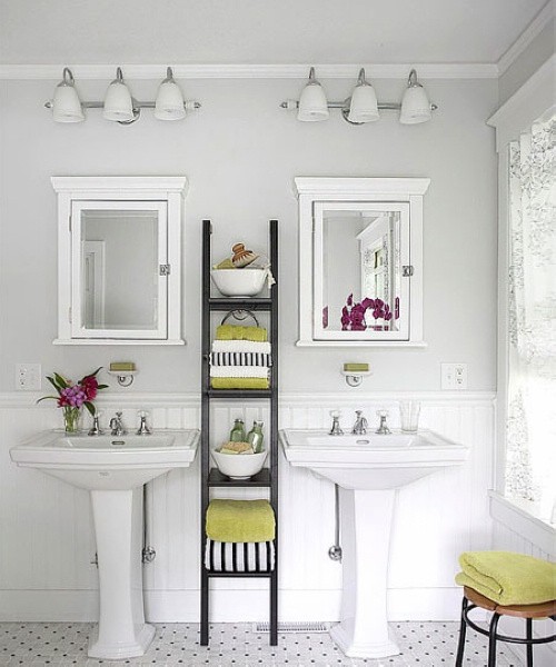 台盆附近的空间想要利用起来,其实很简单,简单的收纳架随意放置在台盆柜四周,不仅让它变得个性起来,还能方便室内收纳。开放式的台盆设计下端已经浪费一点收纳空间,这个时候还不好好利用,卫浴间的杂物怎么办。一个简单的收纳架便能帮你解决不少问题,挂上一点毛巾方便随手取用。