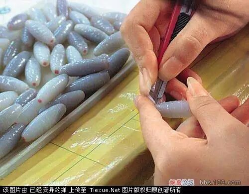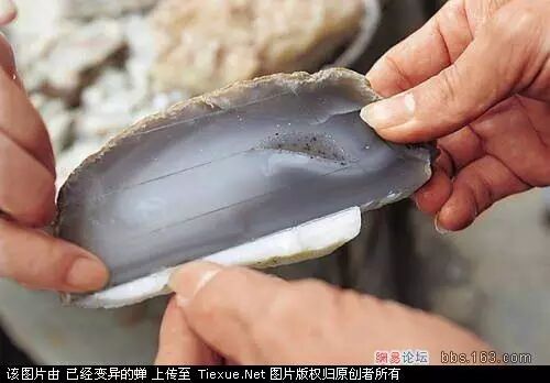 许多厂商,从巴西、乌拉圭进口灰白玛瑙后,会先用刀片划出可切割的部分作为天珠材料。