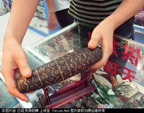 许多天珠业者都在广州荔湾广场批货,各型各色的天珠可随业者发挥,竟可见到保温瓶大小的天珠。