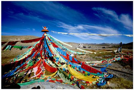 飘扬的经幡,代表了藏区人民对天地平安、风调雨顺、幸福安康的向往期盼与祝福。经幡上印的是佛经,在藏族人民心中,经幡被吹动一次就等于把经文念诵了一遍。