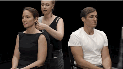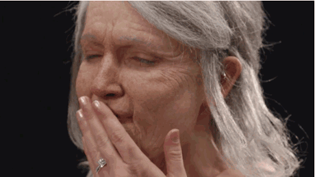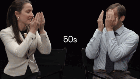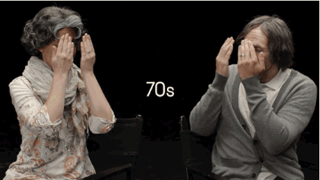 然后是他们70岁时候的样子,当他们放下双手看到彼此的时候,虽然还是带着笑容,但是显然被面前的这个皱纹满面、头发花白的老人吓了一跳。他们直观地看到了岁月在人身上留下的痕迹,他们开始感叹,是什么让彼此变得如此苍老。