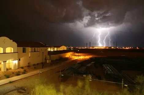 这张在亚利桑纳州凤凰城雷暴雨天气中拍摄的神奇闪电照片,是摄影师耐心、技巧加运气的产物。大概在同一位置经常会看见这样的闪电,他用五秒的快门速度保持拍摄,以正确曝光左前方的建筑,同时希望在适当的位置捕捉到闪电。在拍摄约30次后他的努力终于有了回报,他得到了这张完美构图和曝光的照片。