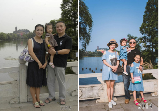 35年前,华允庆26岁,女儿华华只有1岁,两人在镇江金山塔影湖边留下第一张合影;此后,除了1998年因女儿出国没能拍照外,父女俩每年都会在老地方合影。