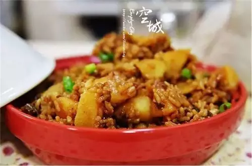 2.切好的土豆粒一开始就放进去和米饭一起煮(免油炸,省事省油省钱)。