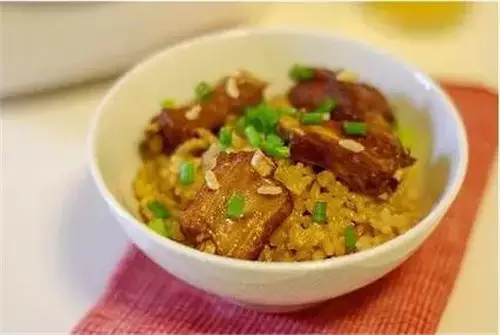 4.盖上煲盖继续煮,跳到保温档后再焖5分钟以上才打开盖(这样米饭焖透了才好吃,肉熟且嫩),最后撒葱花即可开餐啦。