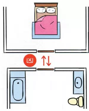 房间里的厕所对到床,情况比房门对到厕所严重,对到头,会头痛、思考时不能集中,住久了会产生肿瘤、中风等;对到腰,会腰酸、心脏无力、水肿,住久了会产生糖尿病、心脏病;对到脚,会坐骨酸痛、膝盖无力、痛风水肿,住久了会产生意外骨折。